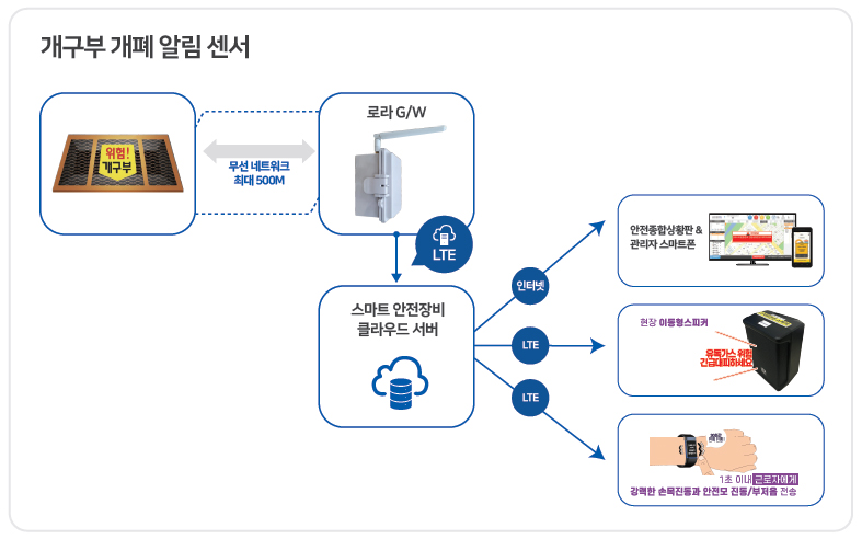 1. °³¿ä °³±¸ºÎ °³Æó ¿©ºÎ¸¦ °¨ÁöÇÏ¿© ±Ùó Á¢±Ù ±Ù·ÎÀÚ¿¡°Ô ½Ç½Ã°£ °æ°í ¾Ë¸² ¹× ¿ø°Ý °ü¸®ÀÚ ½º¸¶Æ®Æù°ú ¾ÈÀüÁ¾ÇÕ»óȲÆÇÀ¸·Î Ǫ½Ã¾Ë¸² Àü¼Û 2. ±â´É ¡á °³±¸ºÎ ¿¸² °¨Áö ¸¶±×³×ƽ ¼¾¼ ¡á °³±¸ºÎ ¿¸²½Ã ±Ùó ±Ù·ÎÀÚ¿¡°Ô °æ°í ¾Ë¸² ¹æ¼Û ¡á µ¿½Ã¿¡ °ü¸®ÀÚ ½º¸¶Æ®Æù°ú ¿ø°Ý »óȲÆÇ ¾Ë ¡á °ü¸®ÀÚ°¡ ÁöÁ¤ÇÑ º¯È°ª ¹ß»ý½Ã ÇöÀå¿¡´Â ½ÎÀÌ·»(105µ¥½Ãº§ ÀÌ»ó) ¾Ë¸² ¡á ¹æ¼ö¹æÁø ±â´É ¡á ¹èÅ͸®»ç¿ë±â°£ 6°³¿ù ¡á ·Î¶ó Áß°è±â »ç¿ë |